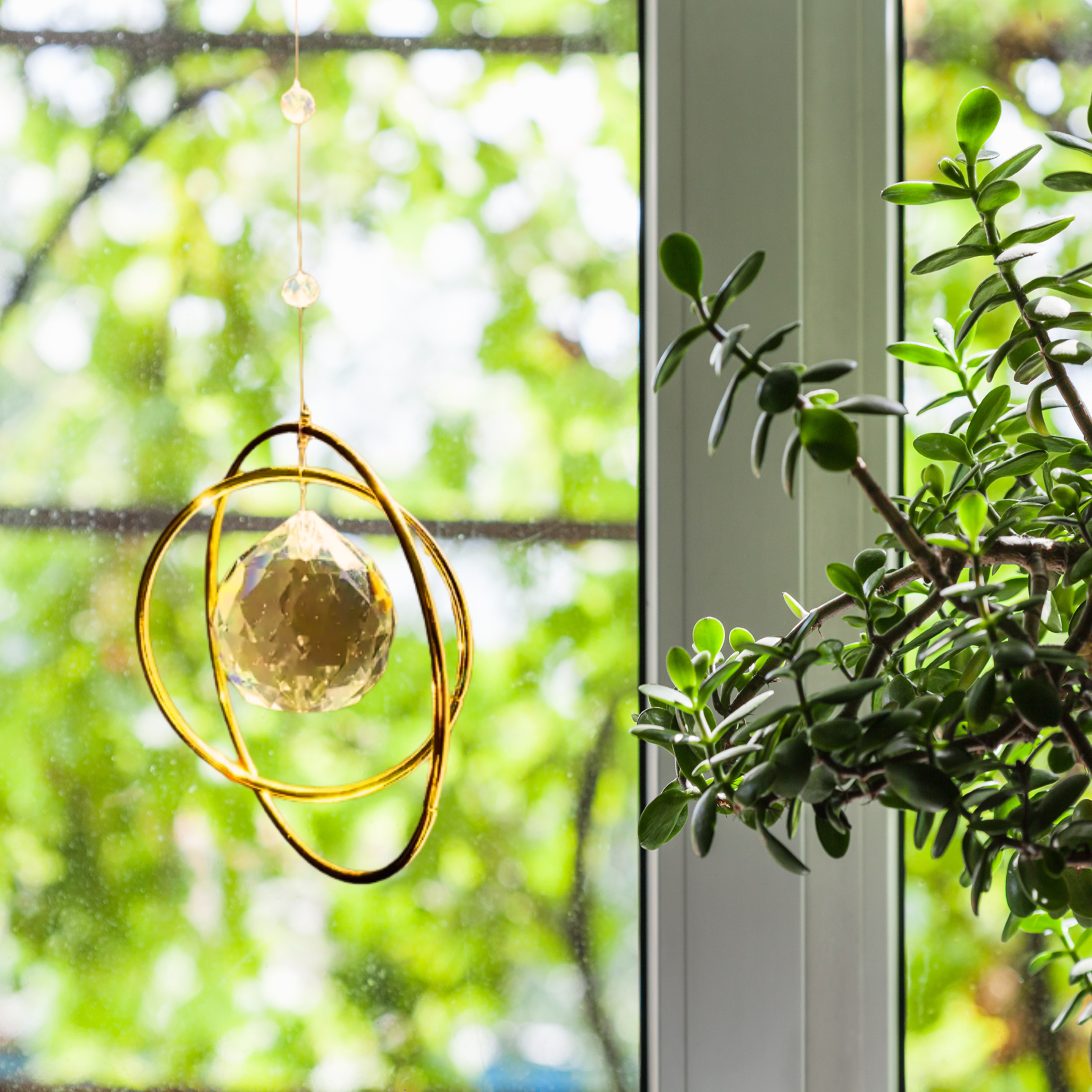Très joli accessoire à suspendre devant une fenêtre ou sous une lampe.  Fait en cristal et laiton doré, cet attrape-soleil égaye tous les endroits où on les place, dès lors qu’ils peuvent jouer avec la lumière. Véritable capteur de lumière grâce à son de prisme en cristal  (pas besoin d’électricité). On utilise ce genre d’accessoire dans le Feng Shui (l’art du bien-vivre dans son milieu de vie, de travail et de loisirs), qui est très prisé; sa présence ajoute une dimension particulière à l’endroit où on le place.
