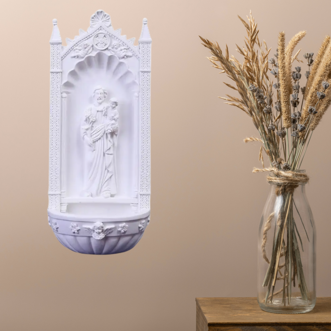 Statue de Saint Joseph en résine blanche, sculpture religieuse, comportant une micro chapelle ornée d’angelots, une statue de saint Joseph aux lis, tenant dans ses bras l’enfant Jésus.  Le tout surmonte un bénitier.  L’ensemble est discret (une vingtaine de cm de haut sur 9 de large – voir description technique ci-après), s’accroche au mur et est idéal pour l’eau bénite.  Voir à ce sujet la cérémonie de bénédiction de l’eau (lien dans la description). A l’achat de toute statue ou objet de culte sur ce site, recevez gratuitement la prière de bénédiction des statues.  Cet article est livré béni, quoi qu’il en soit.