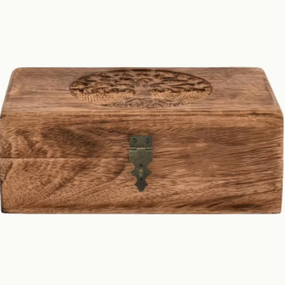 Nombre d’entre nous aiment les boîtes. Celles qui vous sont proposées ici ont pour mission de protéger vos Tarots, mais bien sûr, tous les usages sont permis ! Voici la boîte Arbre de vie, en bois précieux de paulownia [en latin scientifique paulaunia est tiré du nom d’Anna Pavlovna, fille du tsar Paul I er), bel arbre originaire d’Orient, acclimaté en Europe comme arbre d’ornement]. C’est un joli cadeau à faire en toute occasion et qui contiendra des objets précieux comme vos tarots ou des bijoux.