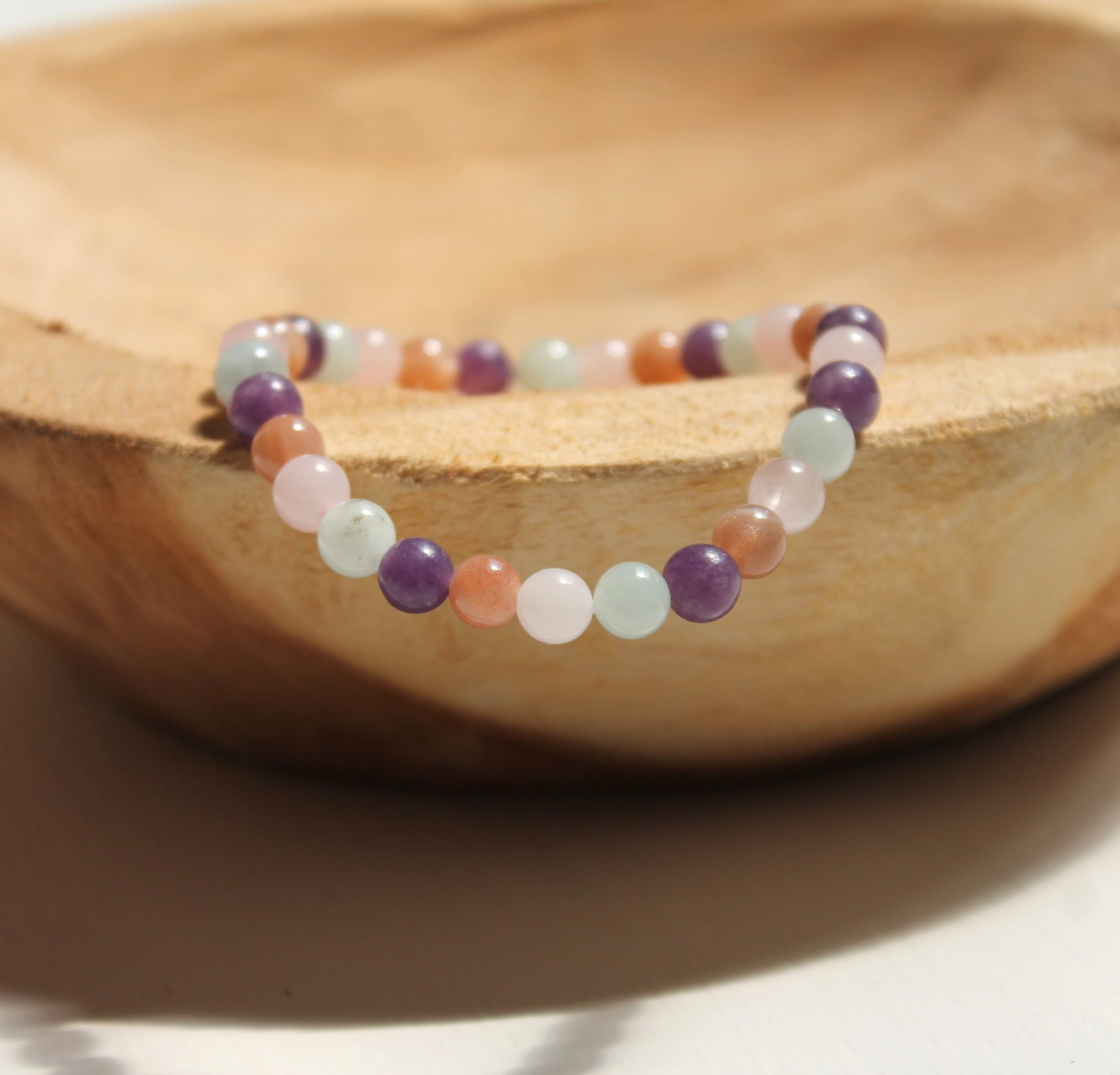 Nature des pierres naturelles : pierre de soleil (héliolite), quartz rose, aigue marine, lépidolite (violet)