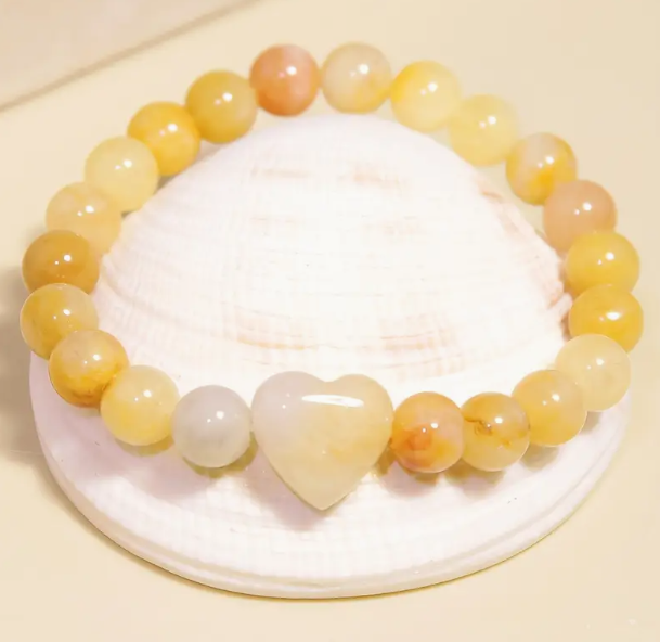 Façon du bijou : pierres roulées de façon artisanale – perles de 8 mm (peut varier légèrement) – Cœur en pierre de soleil – monté sur fil élastique solide