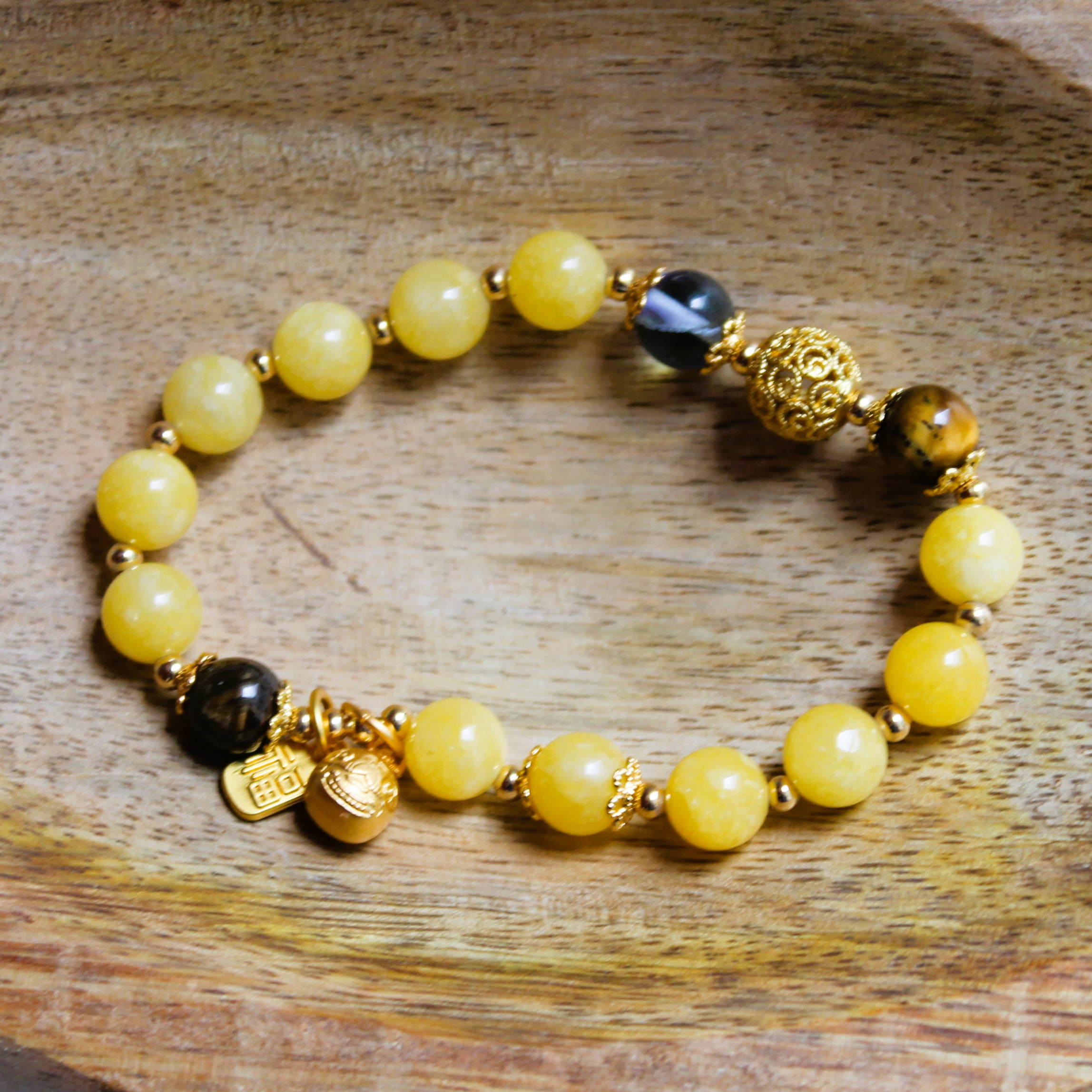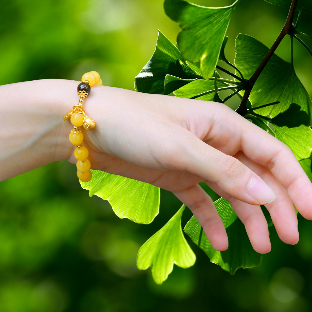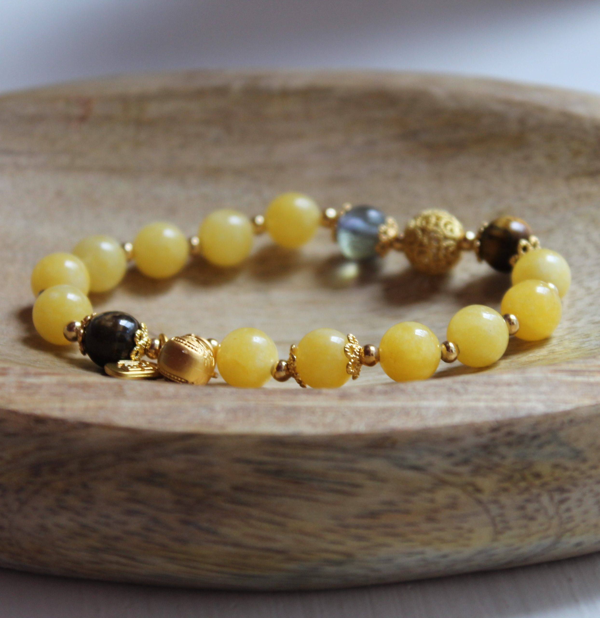 Façon du bijou : pierres roulées de façon artisanale en citrine – perles de 8 mm (peut varier légèrement) – monté sur fil élastique solide.