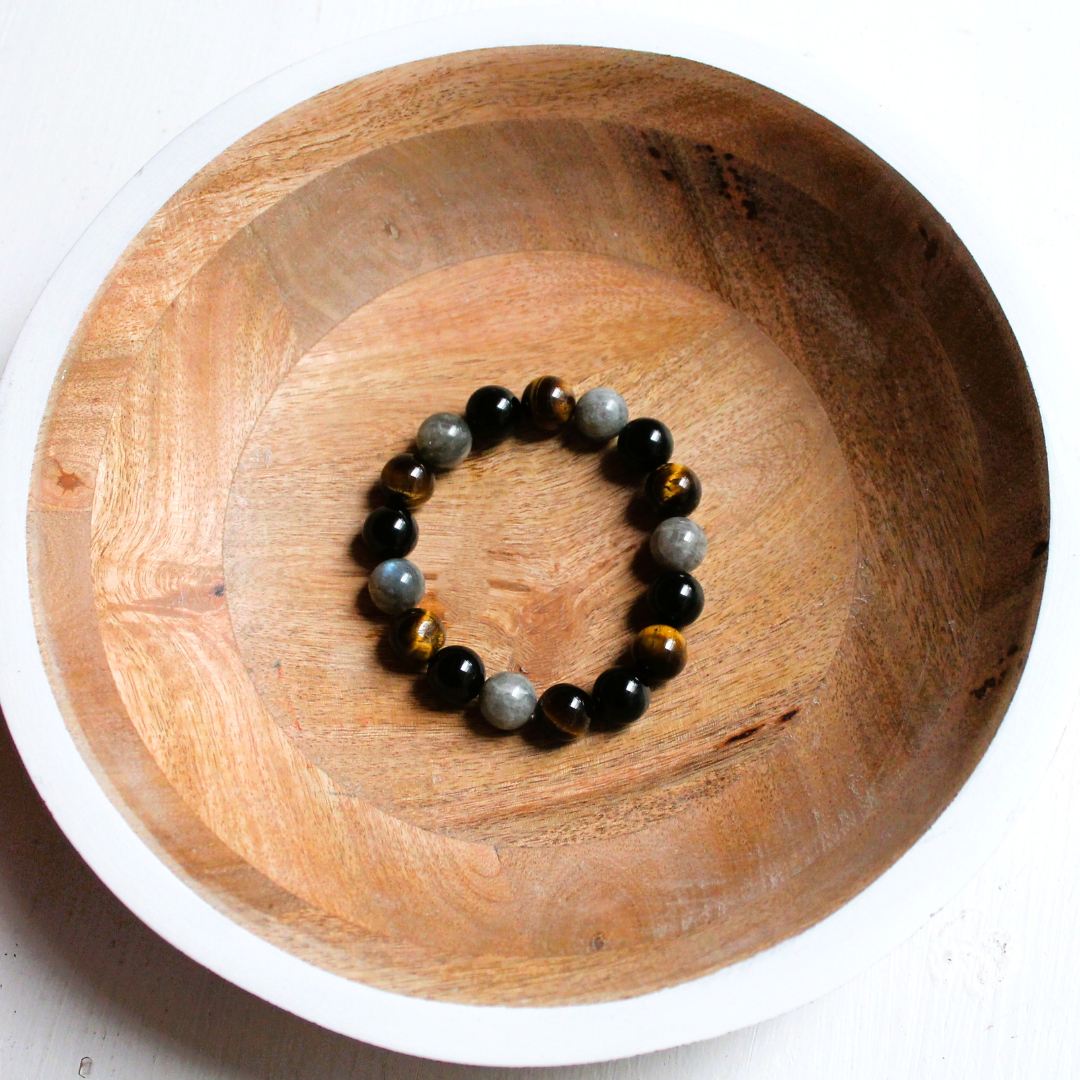 Très beau bracelet en perles roulées, qu’on peut porter en synergie avec d’autres pierres comme l’hématite. La tourmaline aide à surmonter les difficultés de la vie, à changer ce qu’on peut  et donne le courage d’accepter ce qu’on ne peut pas changer. Elle permet de faire la paix avec son passé et d’identifier l’origine de certains blocages souvent liés à l’enfance. Les blessures émotionnelles des expériences passées se transforment en douce guérison. Pierre d’ancrage, la tourmaline brune donne le sens des responsabilités et une pleine conscience de la réalité. L’œil de tigre est une pierre associée à la protection, au courage et à la confiance en soi. La Labradorite quant à elle, est extrêmement protectrice en absorbant le négatif mais aussi en étant un bouclier à part entière. La Labradorite protège à la fois du négatif environnant et à la fois en l’absorbant jusqu’à ce qu’il soit totalement dissout. Un cadeau puissant de protection à tous les niveaux à faire ou à se faire.