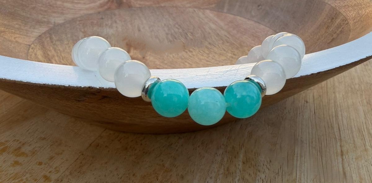 Joli bracelet en sélénite ayant vocation d’antistress.  Il se met en synergie précieuse avec le lapis lazuli ou la hawlite.