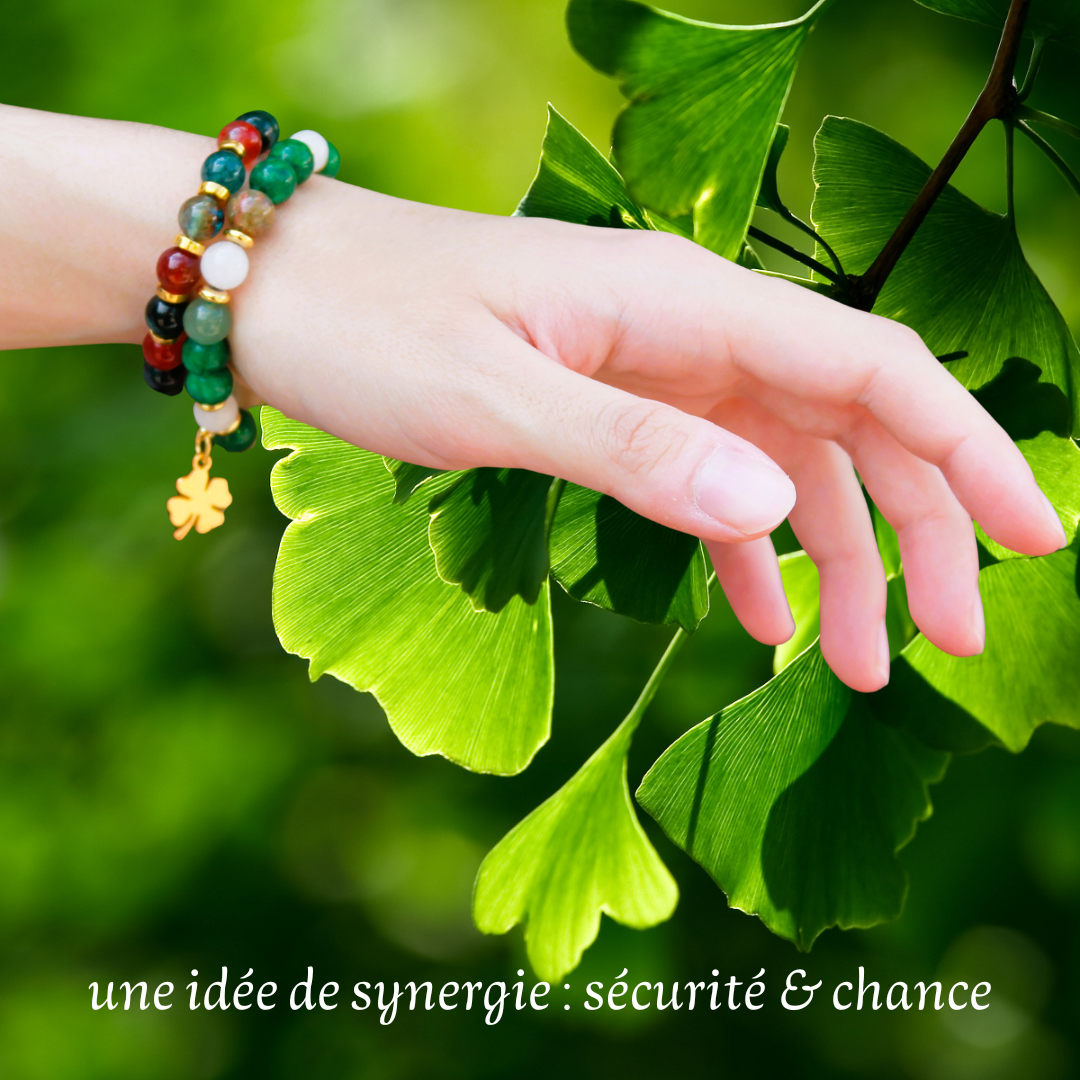 Une idée de synergies ? Portez la tourmaline colorée (sécurité, guérison, sérénité) avec un bracelet or et vert de l’attraction et de la chance, une synergie parfaite !