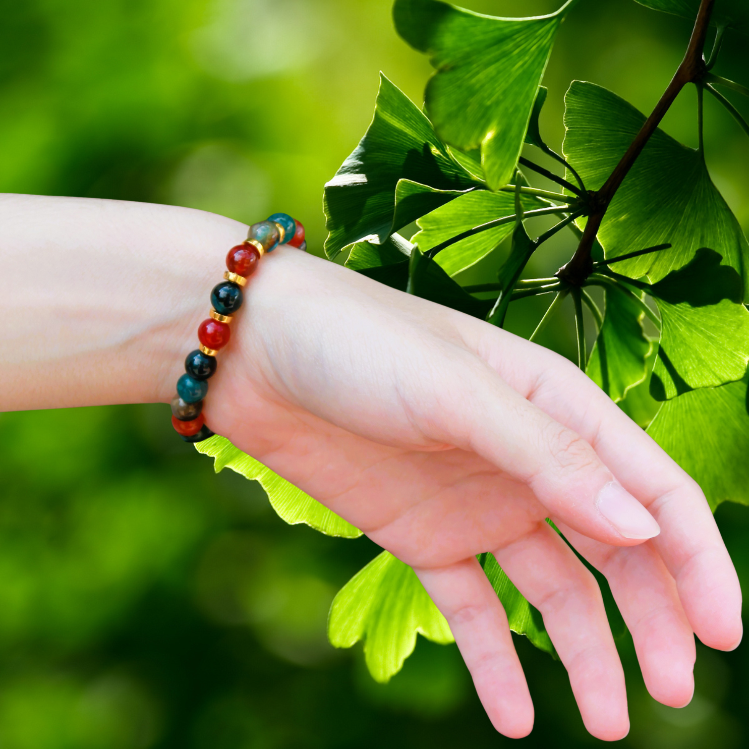 Façon du bijou : pierres roulées de façon artisanale – perles de 8 mm (peut varier légèrement) – et 6 petites perles en métal doré pour rehausser les couleurs – monté sur fil élastique solide