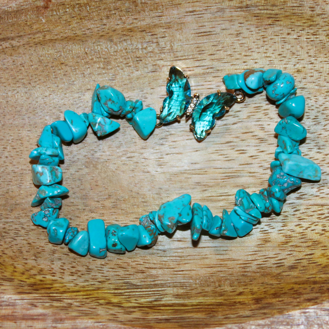 Type : bracelet en perles baroques – pierres naturelles de dimensions variables entre 0,6 cm, monté avec un papillon de cristal synthétique bleu translucide et chatoyant, serti de métal doré