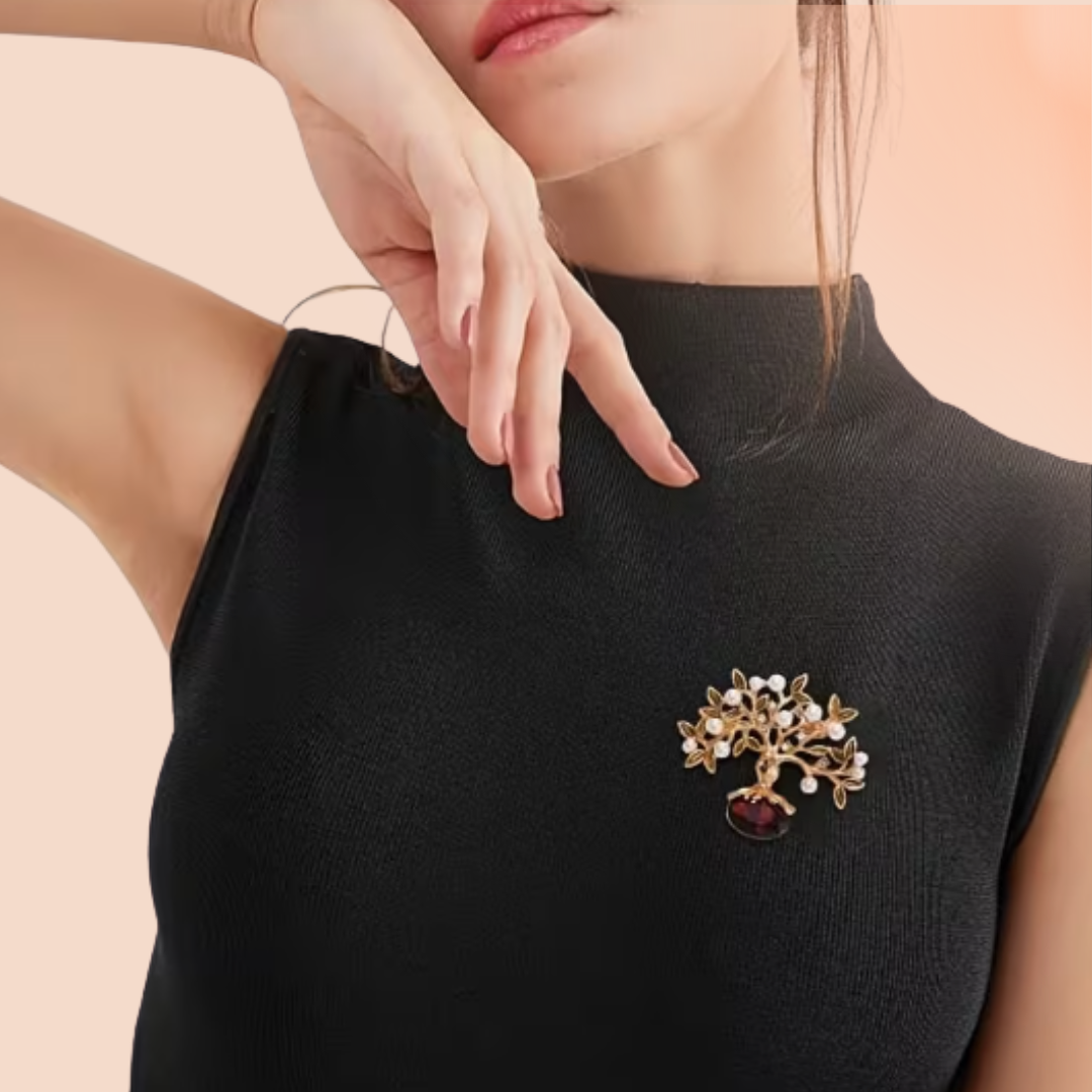 Couleurs : doré, émaux cuivrés, perles nacrées blanches, pierre de grenat synthétique