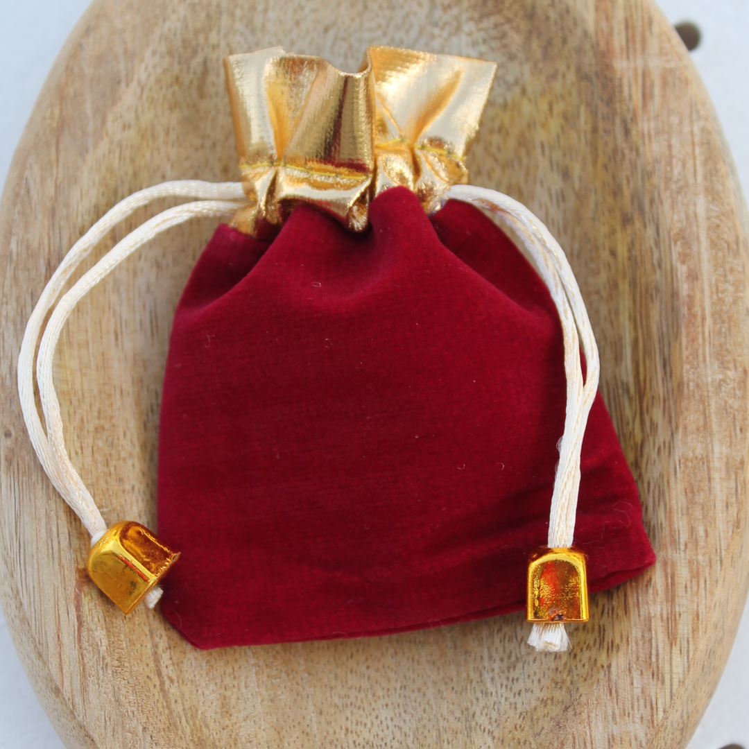 Présentation : dans un sac de velours coloré et or assorti à la couleur du bijou