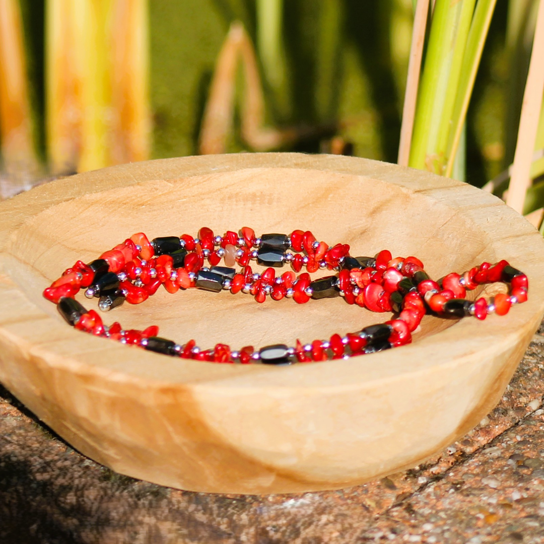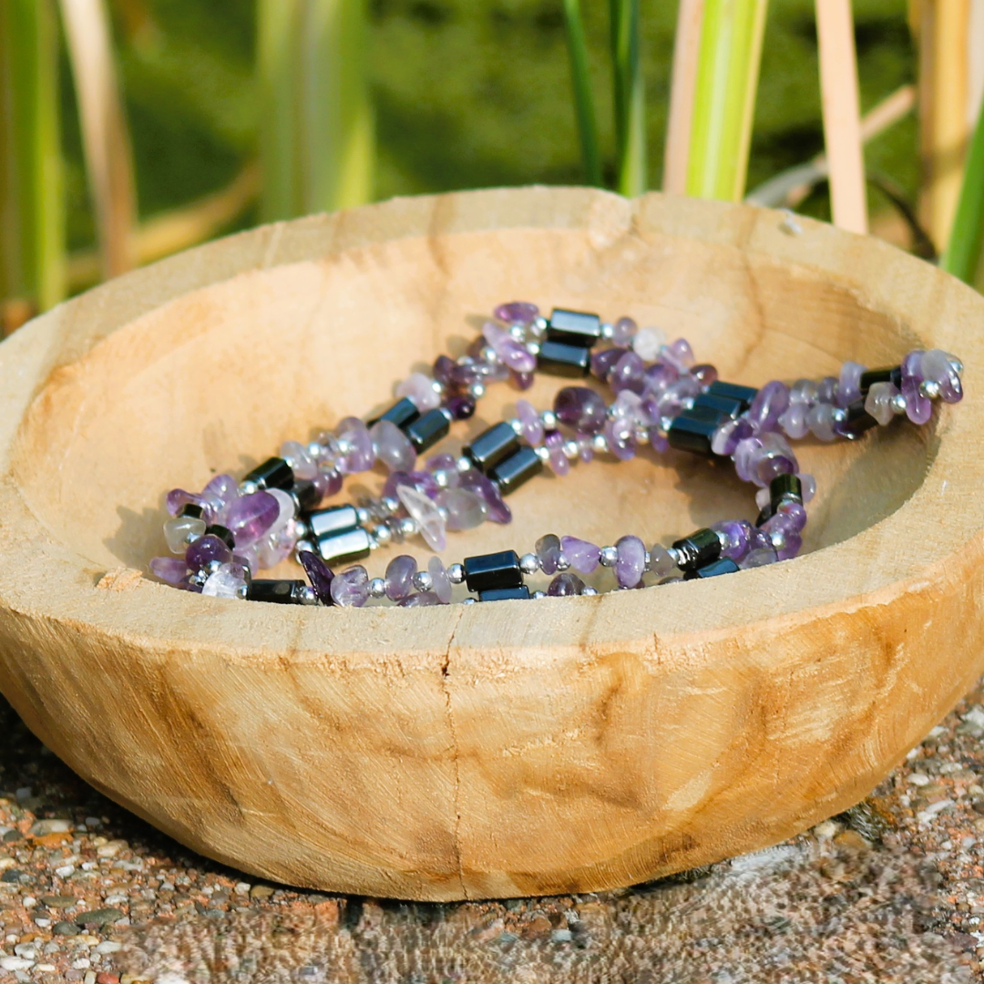 Type : collier en perles baroques – pierres naturelles : cristal de orche 0,5 à 1 cm de largeur & perles polies et bizeautées en magnétite (gris foncé) de 8 mm de hauteur / 2 mm de largeur / chaque perle est séparée par une micro perle sphérique du plus joli effet en métal qui potentialise l’effet magnétique de ce collier