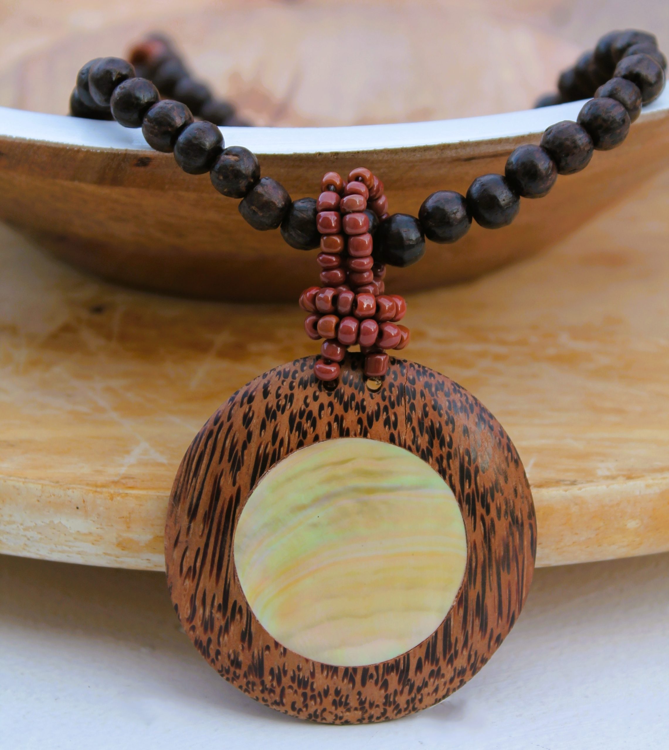 - pendentif disque de nacre serti de bois 6 cm de diamètre