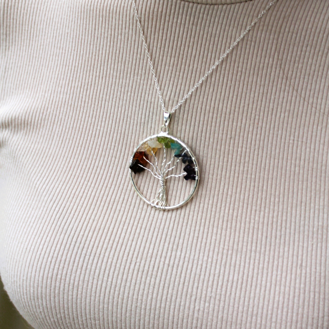 Motif : arbre de vie dont la ramure et les racines sont en argent et les feuilles en pierres naturelles