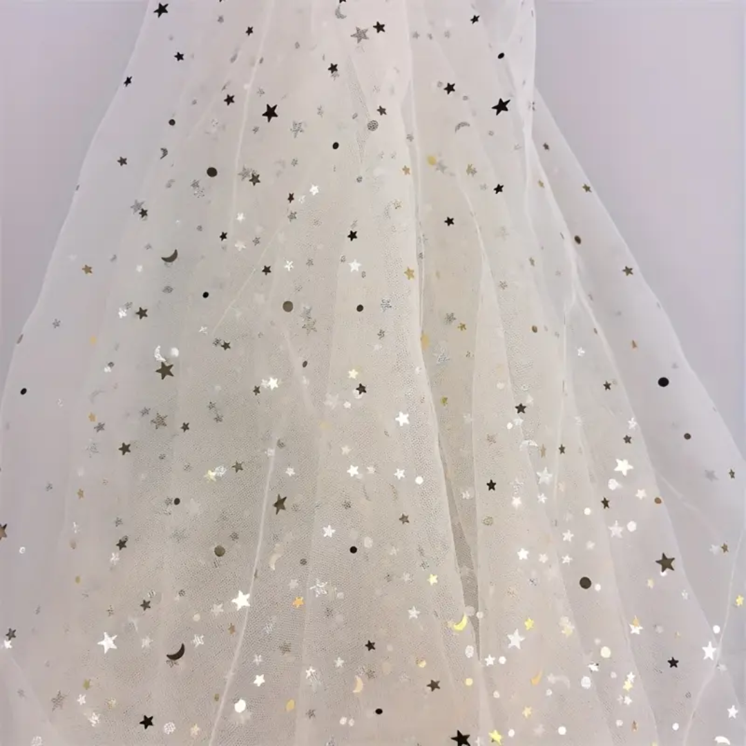 Ornements : paillettes représentant la lune (argentée) et les étoiles (dorées)