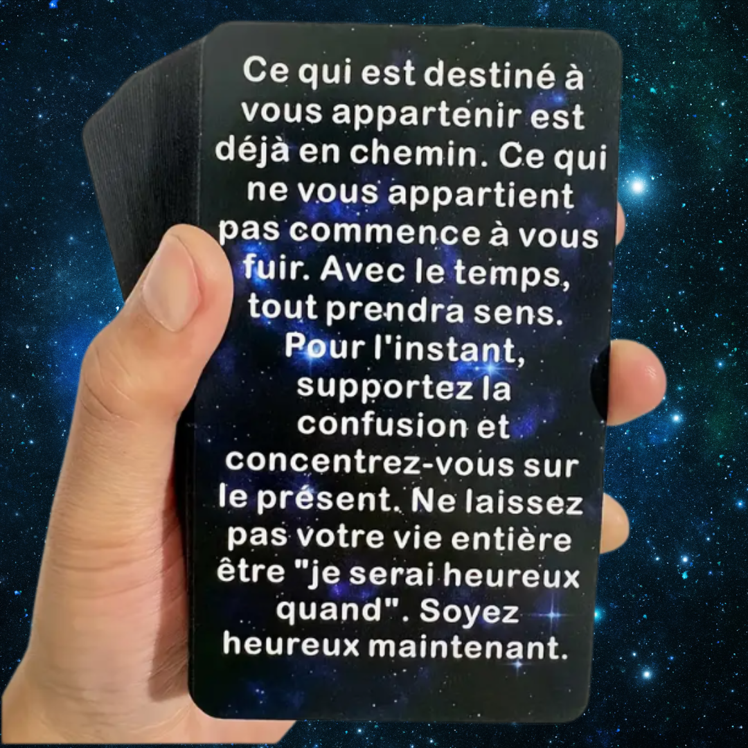 Ce jeu de cartes n’est pas un tarot à proprement parler bien qu’il fonctionne comme peuvent le faire les tarots : le matin, on tire une carte et on a des messages qui donnent la « couleur de la journée » : conseils pratiques ou spirituels, aide à la compréhension du présent pour une meilleure gestion de l’avenir. On peut l’utiliser individuellement, le matin en prenant le café ou en groupe, une forme de jeu entre amis ou en famille. Vous tirerez une carte, puis lancerez la discussion ou le jeu sur la thématique et les conseils précieux qu’elle véhicule. Les cartes sont cartonnées et brillantes, avec illustrations de nuit étoilée, comportent des messages inspirants en français pour une orientation spirituelle. La petite dimension des cartes les rend maniables et permet de les emporter partout avec soi, pour des pauses ludiques entre amis ou pour un soutien spirituel en toute situation.