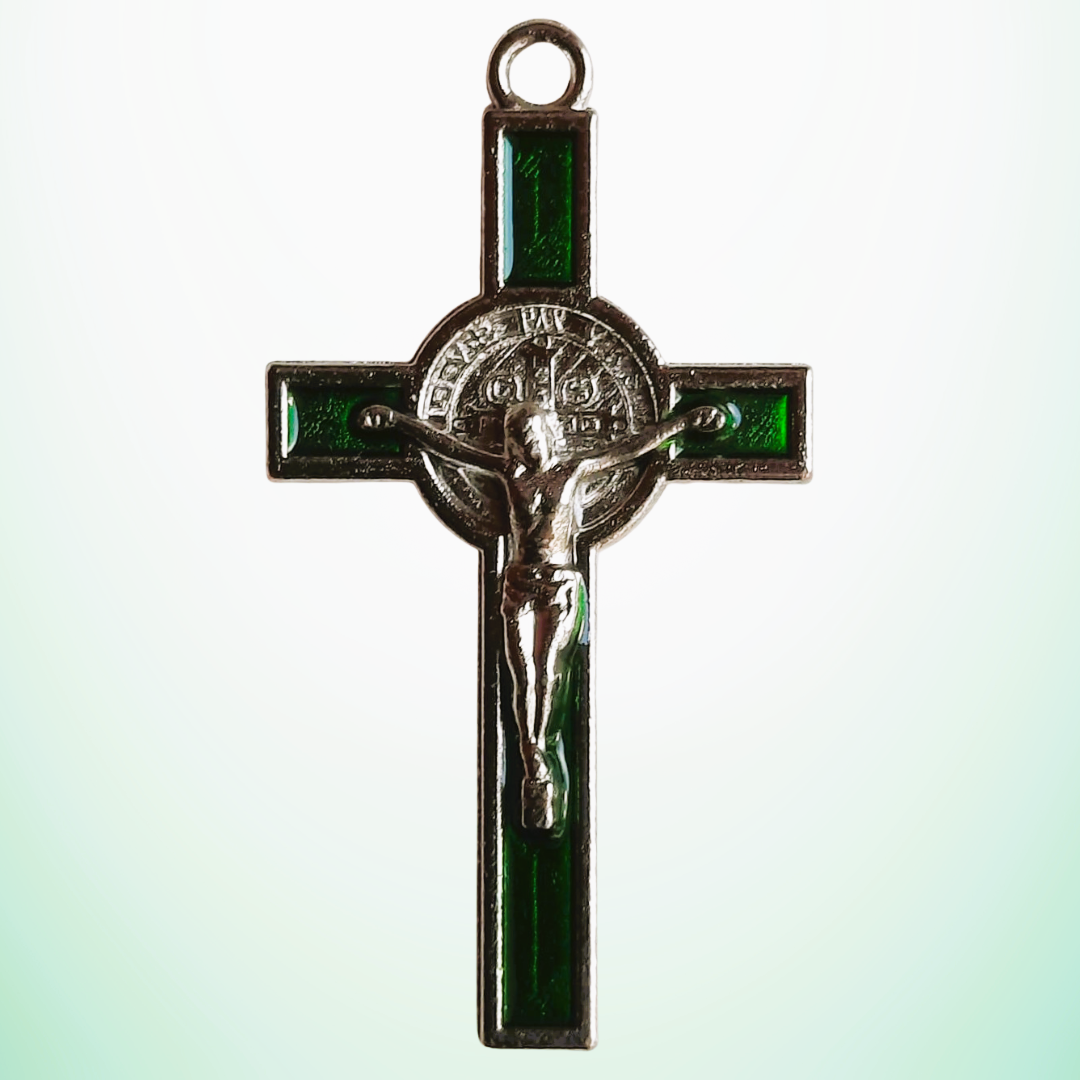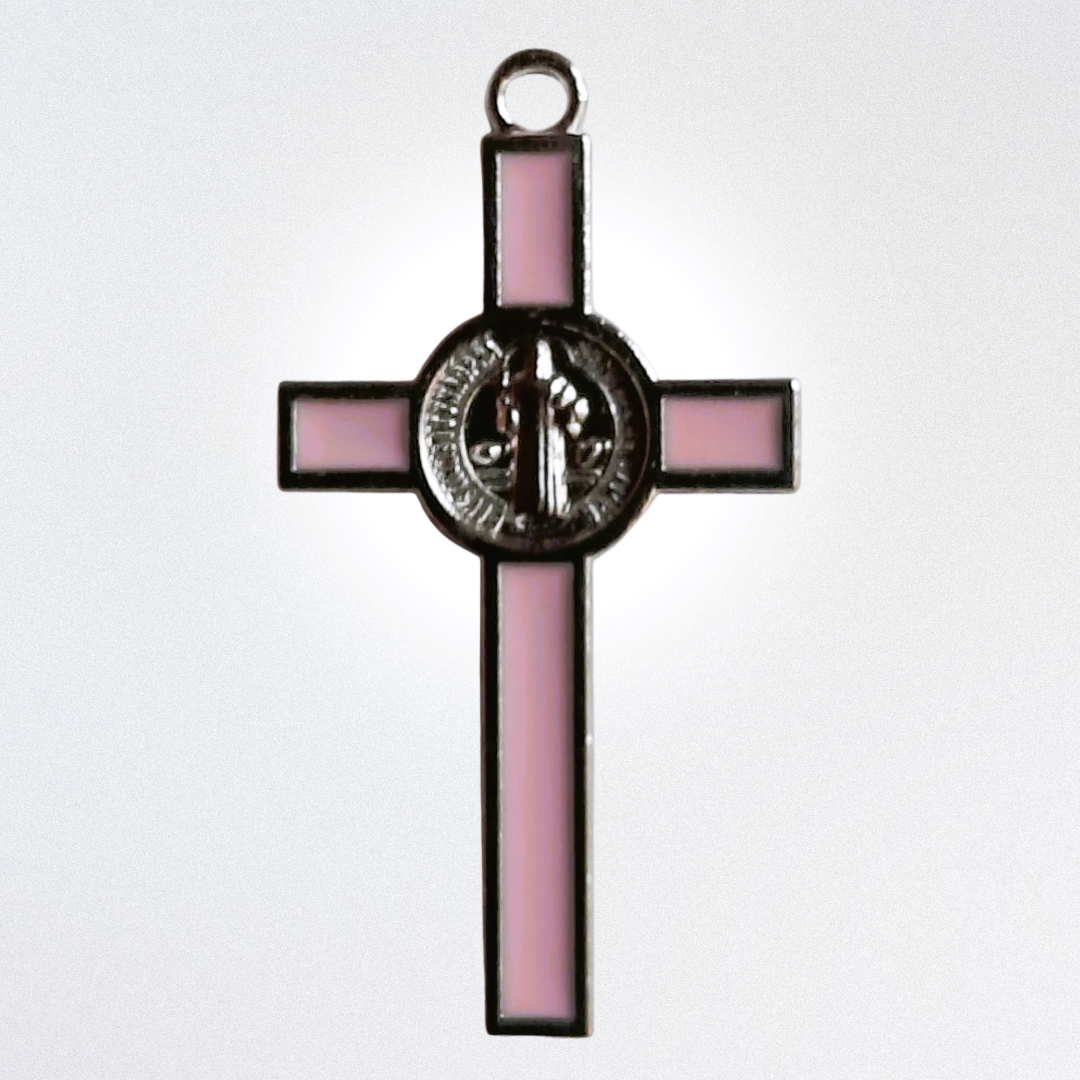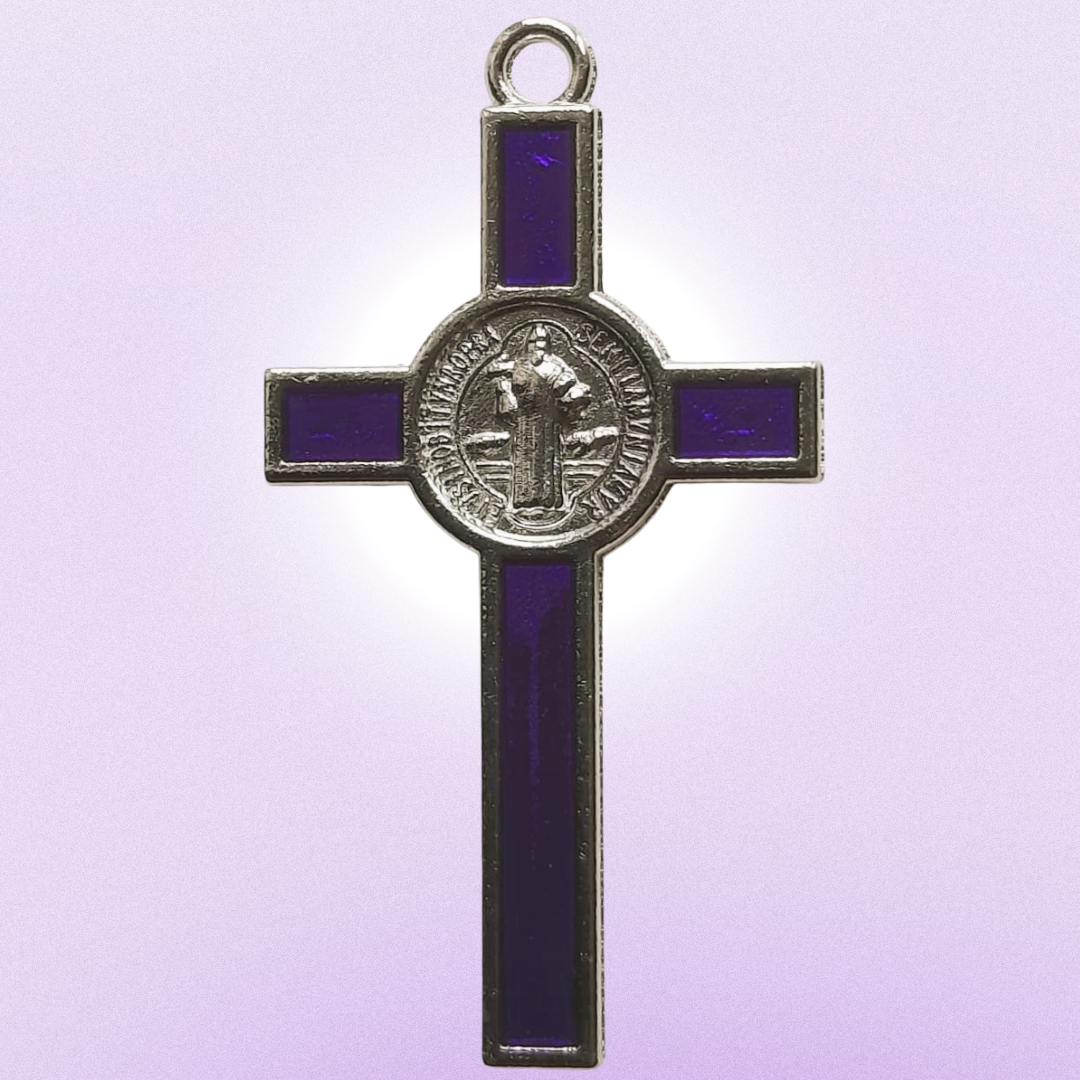 Jolie petite croix de Saint Benoît en acier argenté, sur émail coloré – disponible en 6 couleurs (noir, violet, rouge foncé, bleu, vert et rose).  L’origine de cette croix est très ancienne est demeure à travers les siècles d’une efficacité redoutable contre les assauts des démons, entités, ondes négatives et personnes nocives.  On la suspend au-dessus de la porte d’entrée, une fois dûment bénite, et les personnes négatives ne pourront pas en franchir le seuil. Côté pile, elle porte une médaille gravée en acier, représentant Saint Benoît en tenue d’apparat épiscopal, et l’inscription Eius in obitu nostro praesentia muniamur qui signifie Qu’Il nous défende par sa présence à l’instant de notre mort. Côté face, le Christ en Croix porte en guise d’auréole, dans un cercle, une autre croix de protection, assortie des initiales latines CSPB (Croix du Saint Patriarche Benoît) et les initiales  CSSML signifiant Que cette croix sacrée soit ma lumière.  Le format de ce crucifix en fait un objet de protection décoratif qui peut être suspendu ou posé en un endroit visible pour marquer l’appartenance des lieux à l’énergie sacrée de la protection divine.  Bien sûr, ce crucifix médaille de saint Benoît peut être porté sur soi, en bijousi l’on souhaite rendre visible cette protection dans la vie quotidienne (très légère / ses couleurs ludiques ou sérieuses permettent tous les usages); elle peut être portée discrètement dans une poche également.
