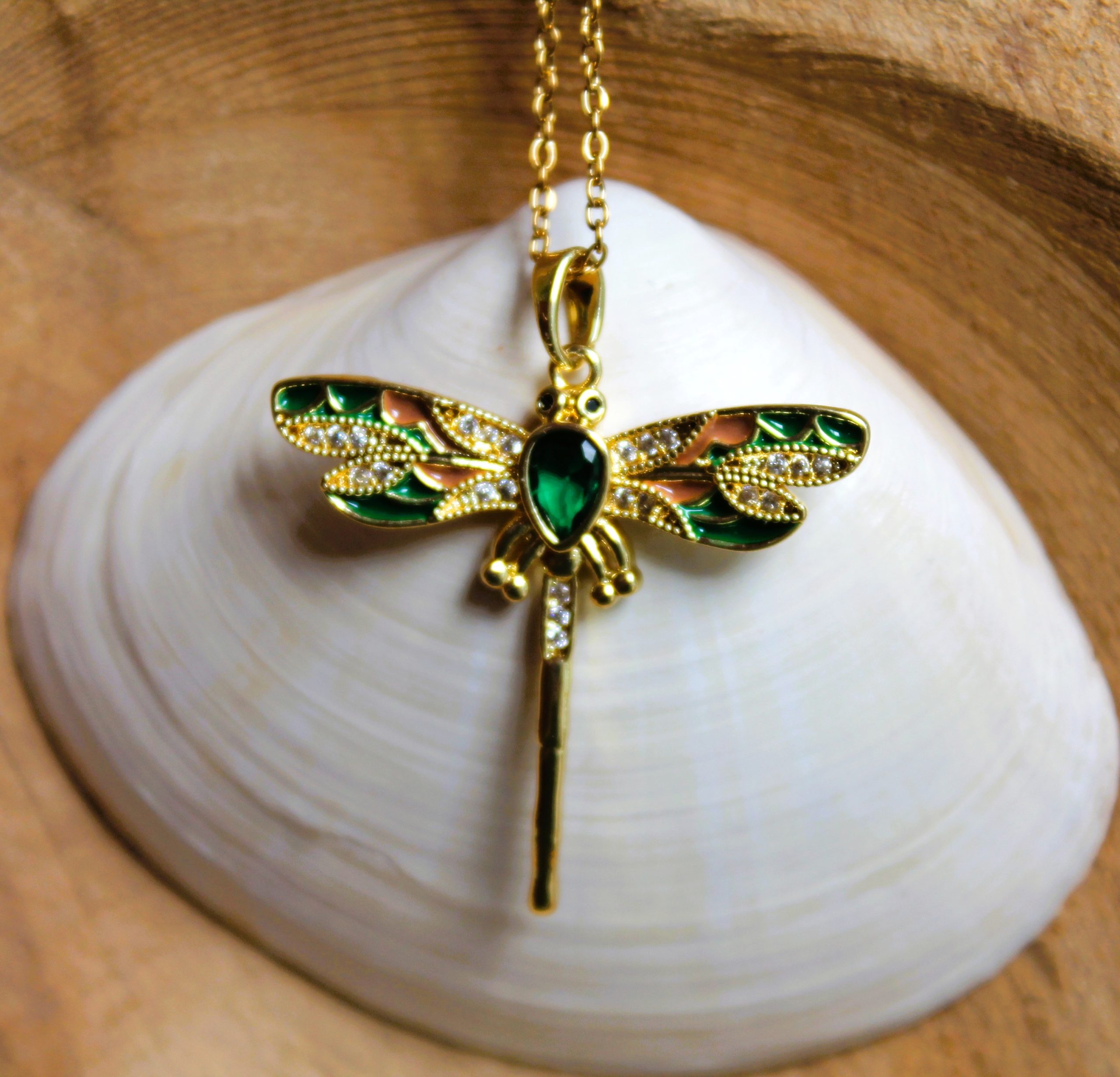 Bijou en forme de libellule, en acier doré inoxydable,  agrémenté de brillants en zircon et de pierres synthétiques couleur verte émeraude