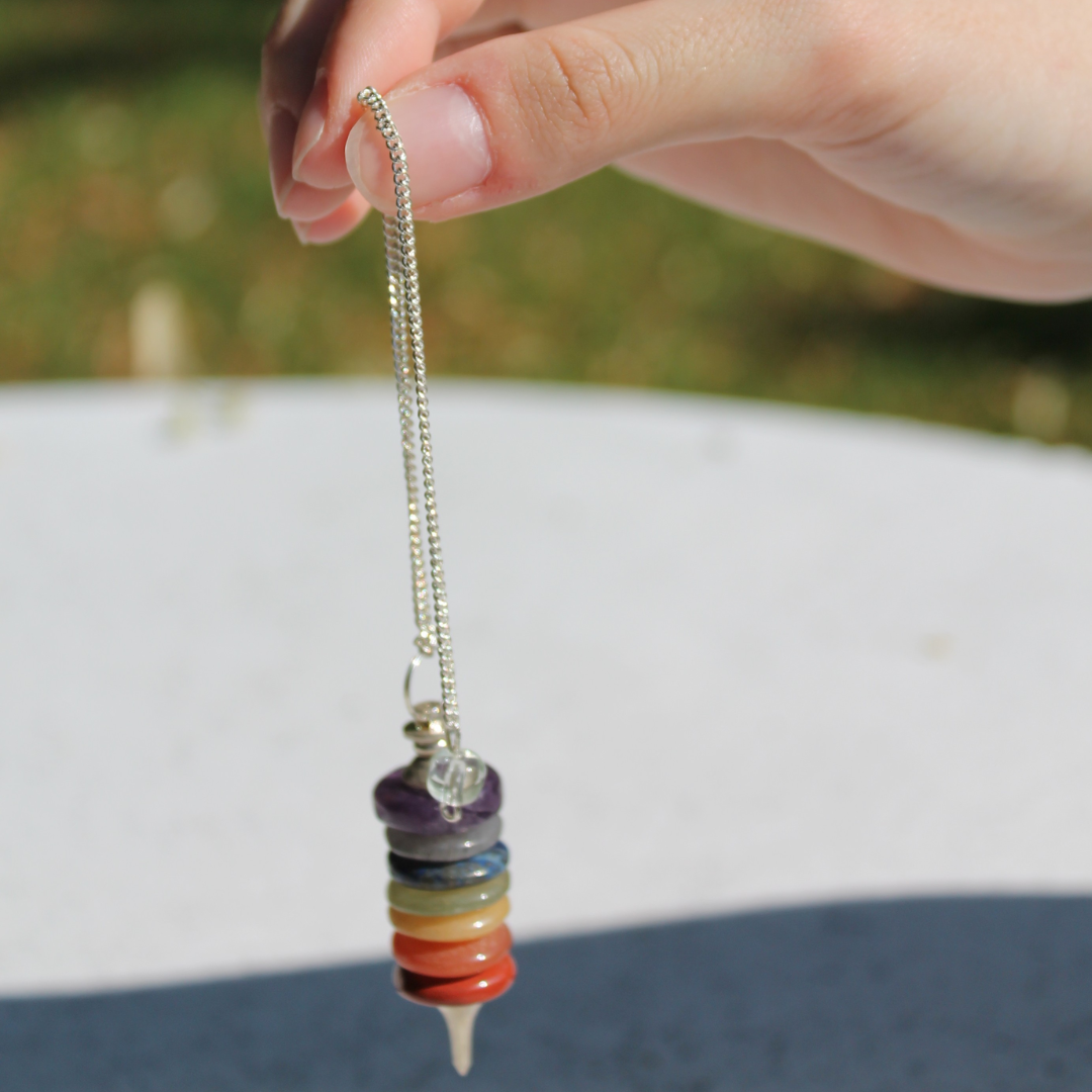 Très beau pendule aux couleurs des 7 chakras de base, idéal pour mesurer le taux vibratoire de chacun des centres énergétiques (chakras) et pour vérifier leur bon fonctionnement ou leurs blocages, pour en rechercher les causes.  Il est constitué de disques de pierres véritables et monté sur une structure en acier, très solide, et esthétique. Il est de taille moyenne et donc facile à transporter en tout lieu et en toute circonstance.  Nous vous le livrons dans une pochette de velours qui le protège.   Ce que vous apporte ce pendule est une compréhension approfondie des 7 chakras en lien avec le corps et l’esprit, une outil pratique et performant de guérison des centres énergétiques, pour la guérison intérieure dans une approche holistique des corps énergétiques. C’est un cadeau idéal à faire ou à se faire lorsqu’on veut étudier l’aperture des chakras et en prendre soin.  Convient aussi bien pour les débutant.es que pour les radiesthésistes confirmé.es. Pour approfondir le sujet, voyez nos Grimoires : Chakras & énergie.