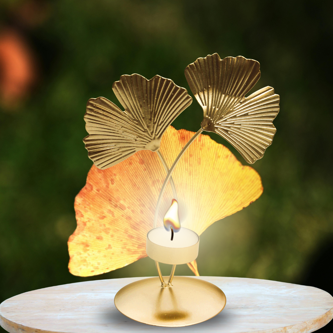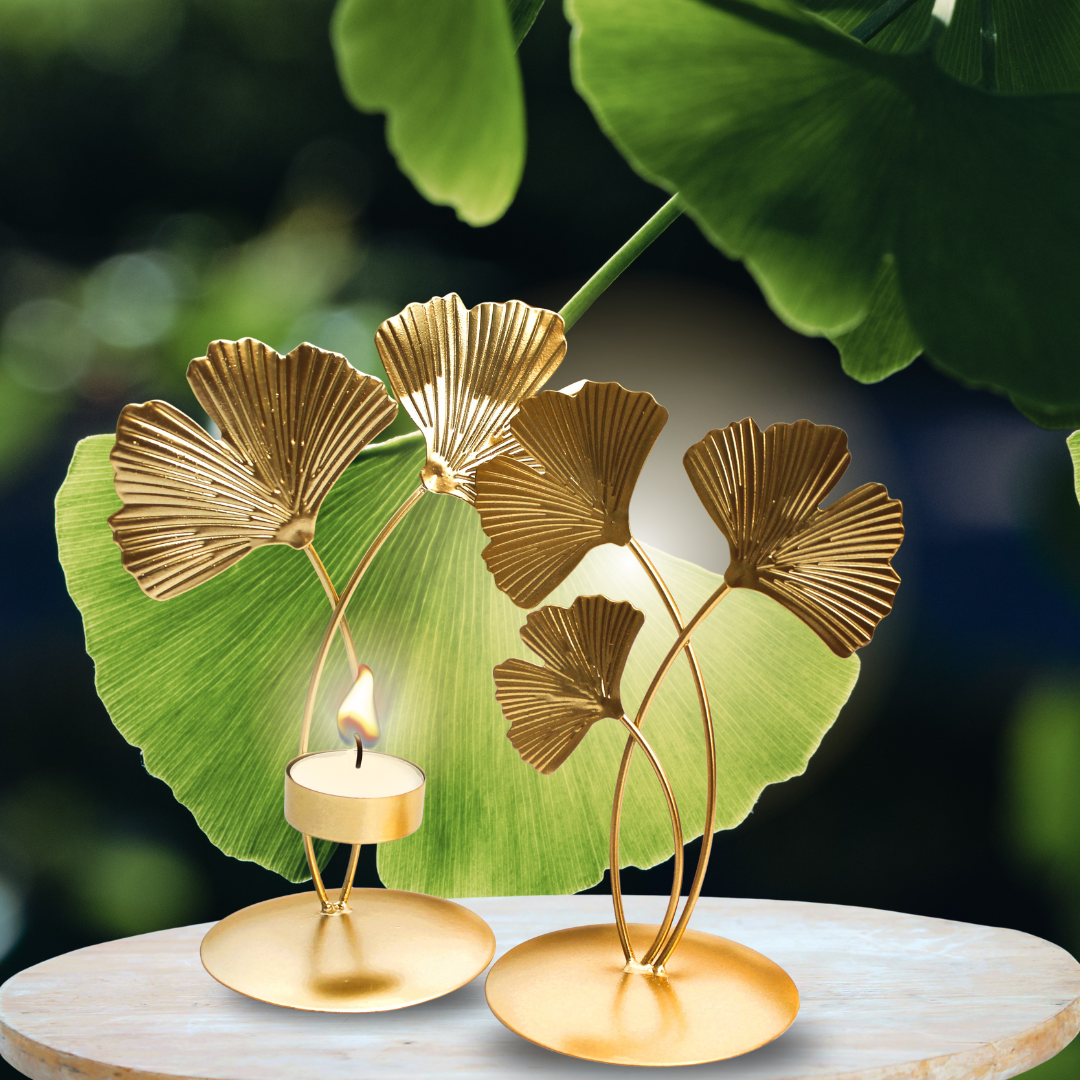 Photophore élégant en métal doré, pour une bougie, agrémenté de feuilles de gingko. Il fera un très bel effet dans votre intérieur, vous mettant en connexion avec l’arbre antique guérisseur : le majestueux Gingko, arbre de la fertilité et de prospérité.