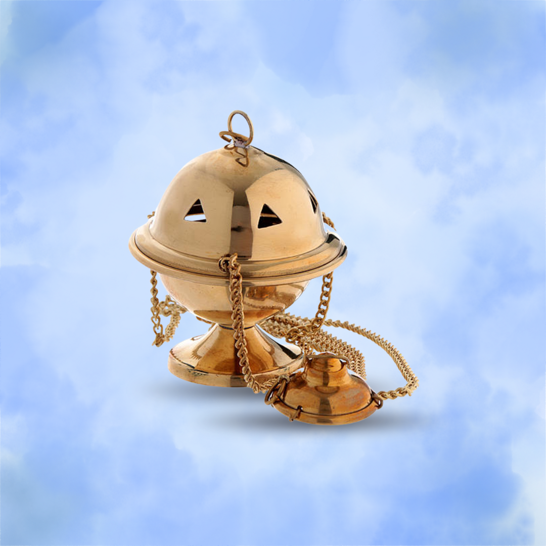 Magnifique encensoir mobile, en laiton doré du plus bel effet, qui permet d’effectuer les bénédictions des lieux et des objets en toute quiétude. Les chaînettes permettent de soulever le couvercle ou de le refermer à volonté, pour le charger de chabons, les allumer, et disposer l’encens. Son matériau est inputrescible et insensible à l’humidité. Le pied permet de poser l’encensoir sans risque de brûlures, mais il faut toutefois veiller à éliminer tout risque lié à la chaleur de la combustion des charbons qui est de 400° Celsius.