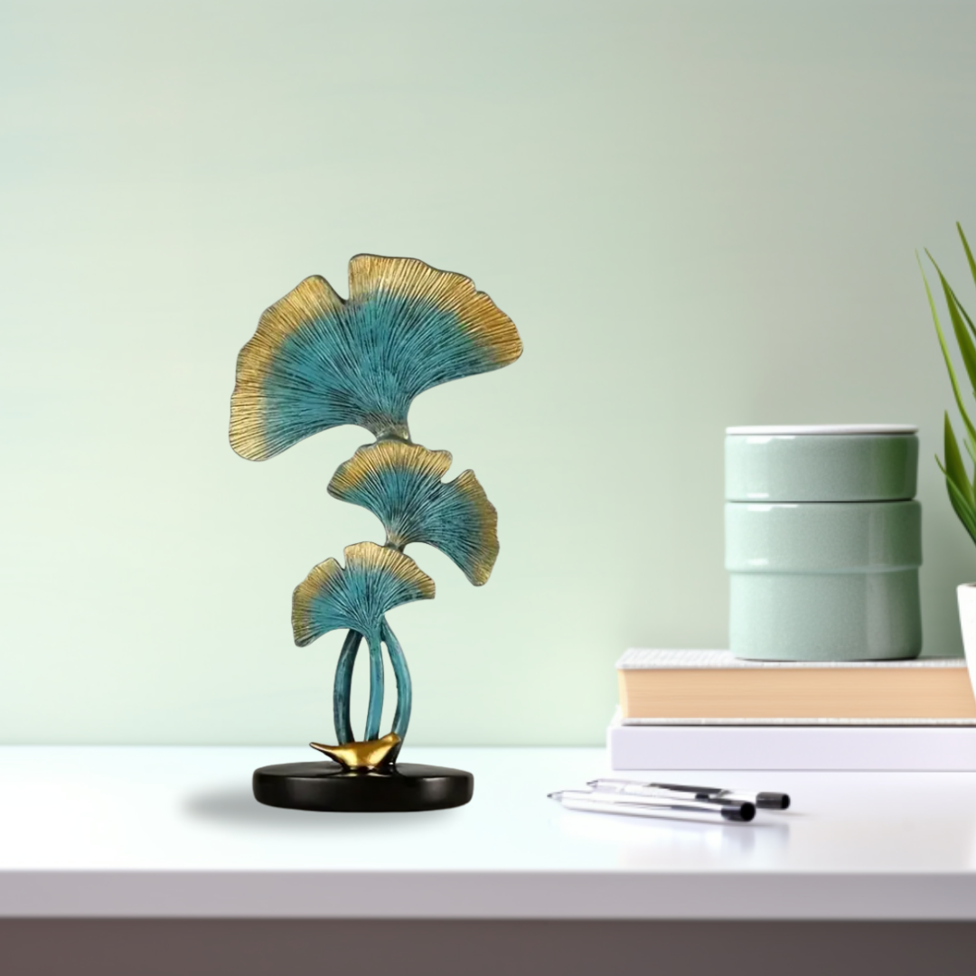Sculpture en forme de feuilles de ginkgo dorées ou dorée et bleu canard – Décoration de table en métal inspirée de la nature, du majestueux Gingko Biloba, pour la salle à manger, le séjour, ou la bibliothèque. Finition soignée, cadeau idéal à offrir ou à s’offrir pour décorer votre intérieur de façon originale et sophistiquée. Cette sculpture s’harmonise avec d’autres articles de notre collection GINGKO. La symbolique du gingko biloba est ancestrale et confère la chance, la longévité et une grande puissance de travail à qui porte le bijou, s’entoure d’objets le représentant, ou consomme la plante. Lorsque vous lancez une belle entreprise, entourez-vous des vertus du gingko dont on dit qu’il est le plus vieil arbre du monde. Nourrissez votre cerveau de sa teinture-mère, portez ses couleurs en bijoux et offrez-vous des éléments de décoration Fend Shui qui vous maintiendront dans l’intention et dans la réussite. Elégance garantie. A noter, son socle est agrémenté d’une petite sculpture en forme d’oiseau doré car il est considéré comme un symbole de spiritualité et l’oiseau est le messager entre les mondes spirituel et terrestre ; il est aussi associé à la protection des âmes et parfois lié à la dualité (yin et yang) en raison de sa feuille unique divisée en deux lobes, une symbolique que l’on retrouve dans l’art.