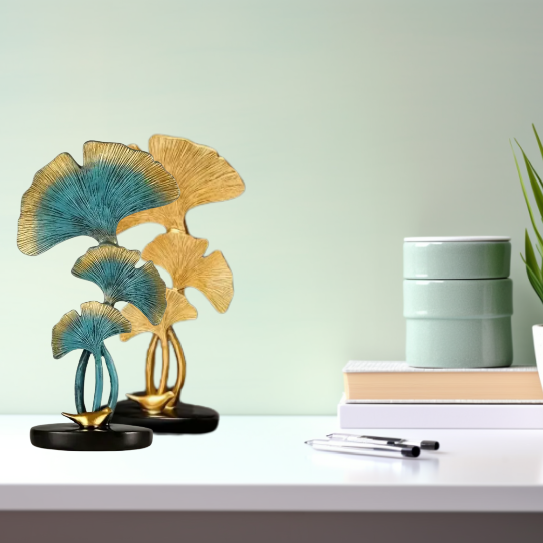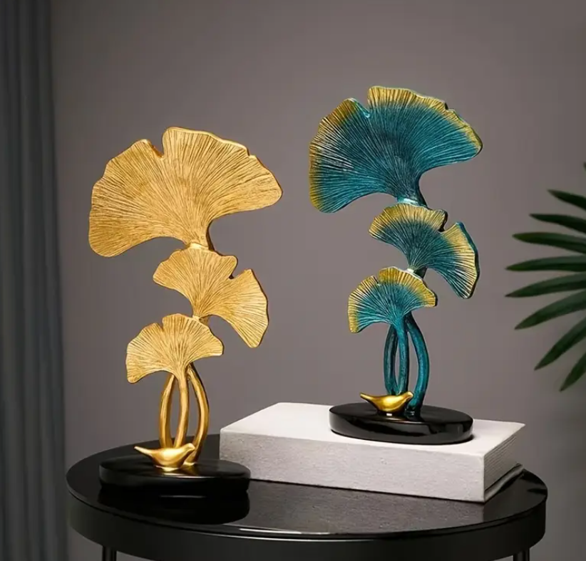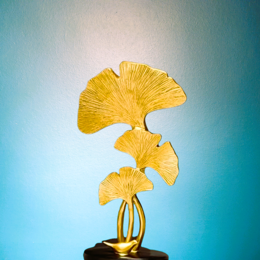 Sculpture en forme de feuilles de ginkgo dorées ou dorée et bleu canard (voir notre autre sculpture) – Décoration de table en métal inspirée de la nature, du majestueux Gingko Biloba, pour la salle à manger, le séjour, ou la bibliothèque. Finition soignée, cadeau idéal à offrir ou à s’offrir pour décorer votre intérieur de façon originale et sophistiquée. Cette sculpture s’harmonise avec d’autres articles de notre collection GINGKO. La symbolique du gingko biloba est ancestrale et confère la chance, la longévité et une grande puissance de travail à qui porte le bijou, s’entoure d’objets le représentant, ou consomme la plante. Lorsque vous lancez une belle entreprise, entourez-vous des vertus du gingko dont on dit qu’il est le plus vieil arbre du monde. Nourrissez votre cerveau de sa teinture-mère, portez ses couleurs en bijoux et offrez-vous des éléments de décoration Fend Shui qui vous maintiendront dans l’intention et dans la réussite. Elégance garantie. A noter, son socle est agrémenté d’une petite sculpture en forme d’oiseau doré car il est considéré comme un symbole de spiritualité et l’oiseau est le messager entre les mondes spirituel et terrestre ; il est aussi associé à la protection des âmes et parfois lié à la dualité (yin et yang) en raison de sa feuille unique divisée en deux lobes, une symbolique que l’on retrouve dans l’art.