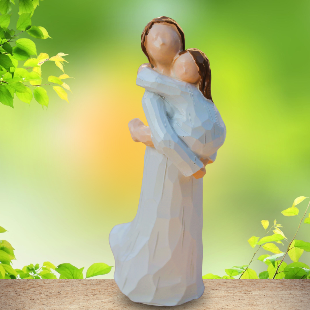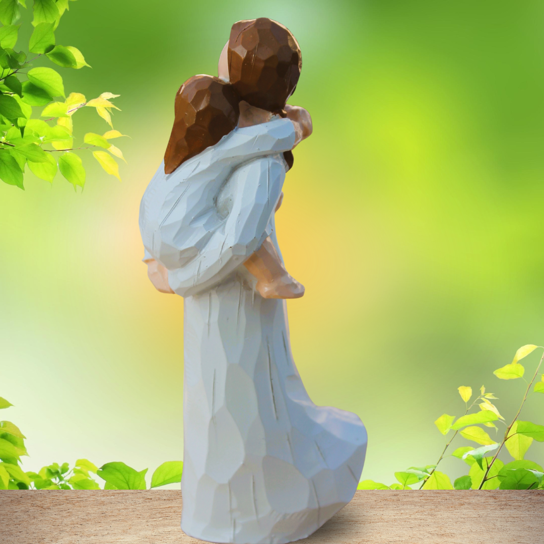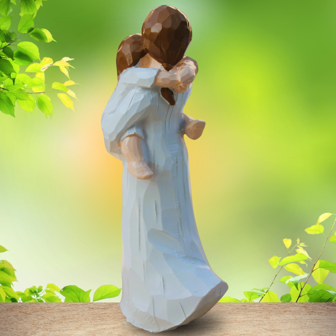 Statuette colorée représentant une maman portant son fils dans les bras (résine teintée dans la masse)