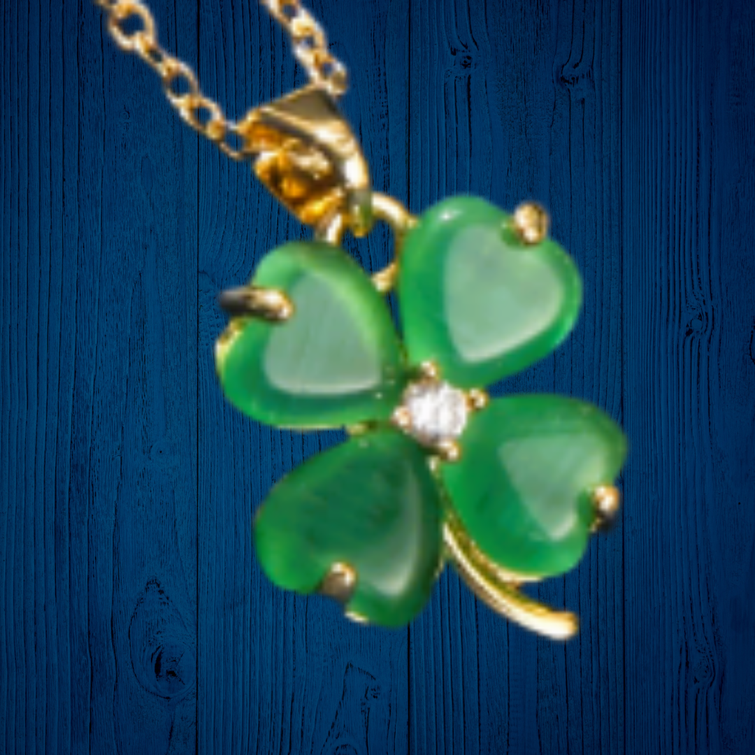 Très joli pendentif en forme de trèfle à 4 feuilles, en verre translucide, d’un joli vert vif.  Les quatre feuilles sont serties de métal doré ; le cœur du trèfle est en zircon façon diamant. Le système de suspension et la queue du trèfle sont en métal doré également.
